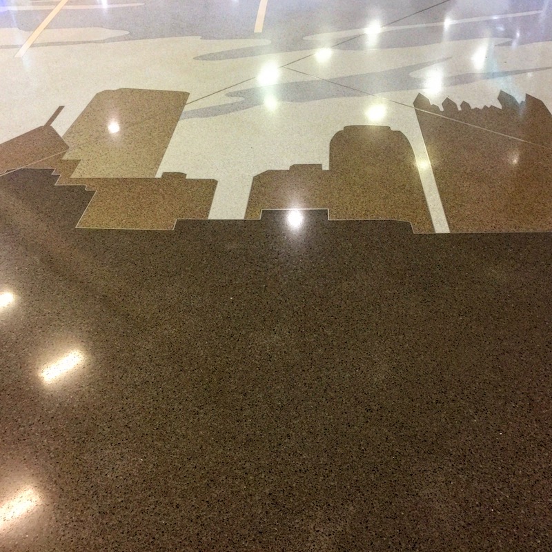 Anyone visiting the airport in the last four years has noticed the massive floor project. Gone are the dated old clackety-clack tiles, replaced with a truly gorgeous terminal-wide terrazzo floor depicting four large-scale scenes.