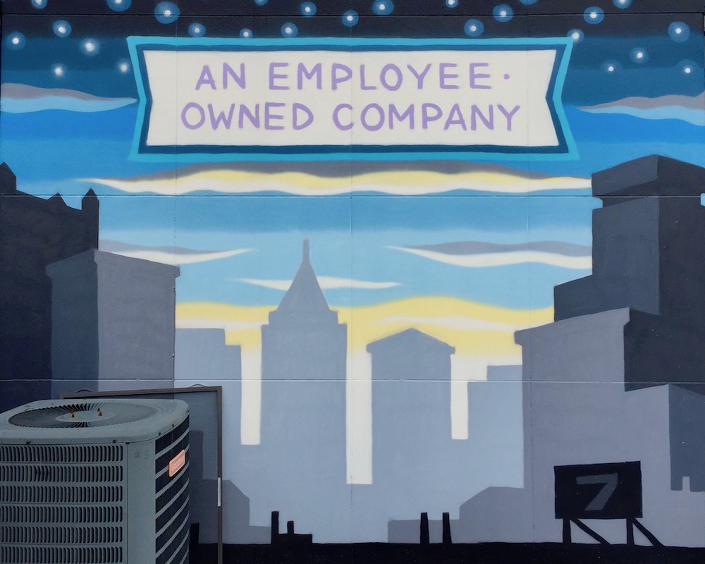 One of these includes the downtown skyline, cast in amber hues from that same looking-east vantage point. It’s not as pretty as the radiant blue skies and stylized cloud forms elsewhere in the design, but the nods to legit downtown buildings–you know which is which by now–make this a winner, too.