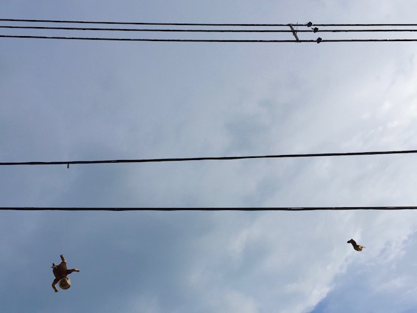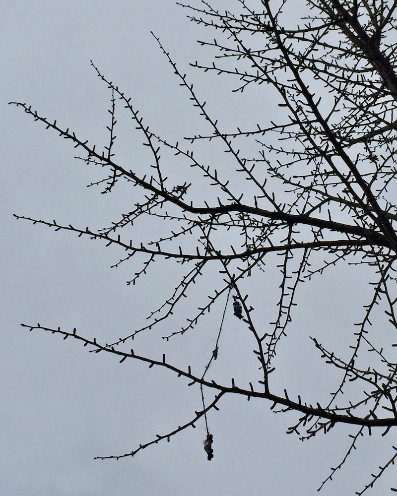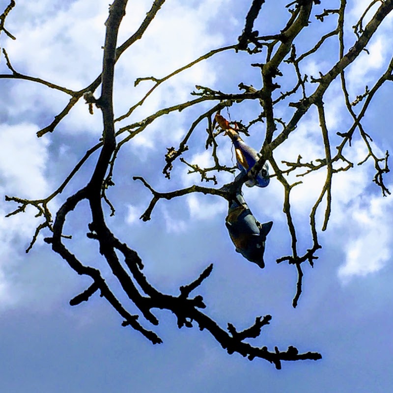 The revelation that the string of sharks was not a one-time deal would have–should have–been enough, but we were in for a couple more shocks. Mere feet away–O.K., maybe one or two hundred of them–was another bare tree with another set of dangling fish. In this case, two bug-eyed, cartoonish blue fish and one tiny red-orange fellow. Unlike the previous two marks of The Dangler, this trio was connected by wire (not twine) and thrown way up high, out of arm’s reach, but well within eyesight.