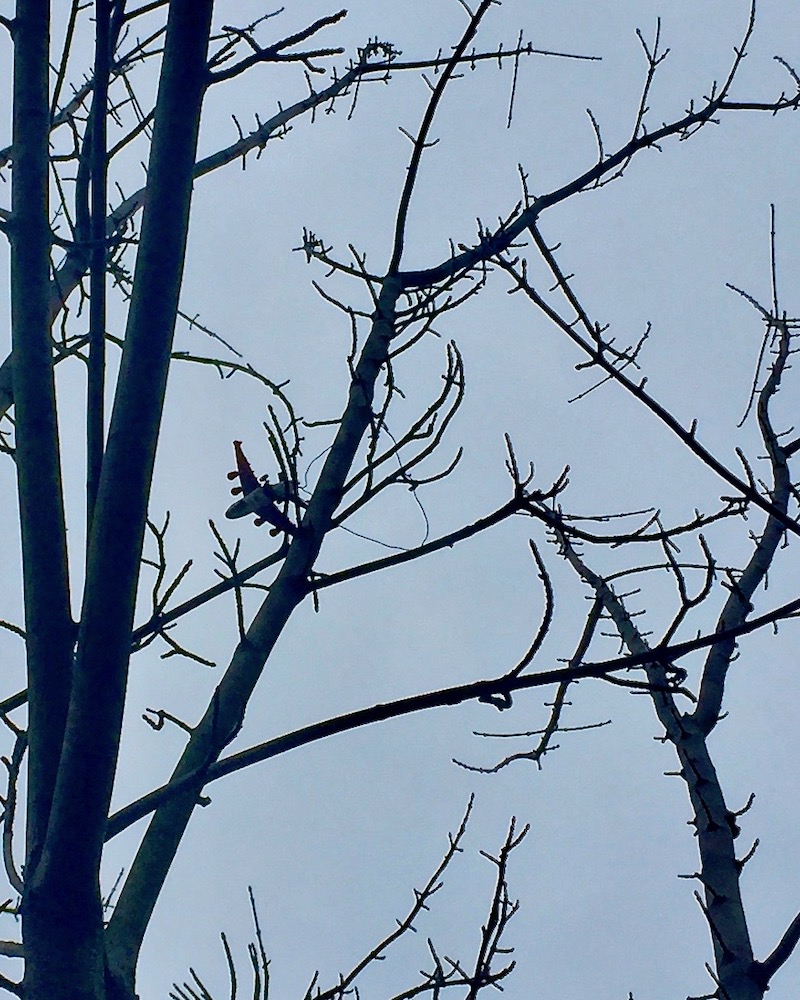 BREAKING NEWS: On the eve of going to press, The Dangler dropped another bombshell on us. There, in those same Centre Avenue street trees hangs yet another dangled concoction. This one appears to be just two toy airplanes, one a bulbous, cartoonish propeller; the other, a second Dusty Crophopper. As of this writing, the dangled bits remain tree-side.