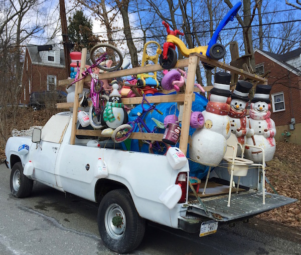 And what a sight it is to see! Tiny Fairley Road is really just a paved circle containing seven otherwise unremarkable residences. Bill Ansell’s is the only house sitting in the island formed by the looped street and as such, it has a large, awkwardly-shaped oval plot. About a third of the yard is covered with blue plastic tarps with an array of broken children’s toys and mangled plastic Christmas displays holding down the fabric. At the property’s edge are a series of plastic (mannequin?) heads on staked crosses featuring Warning: security cameras in use signs and hand-written inscriptions like “God’s country.” Ansell’s white pickup truck is parked on the street and comes loaded with a Santa-sized cargo of discarded toys, holiday lawn ornaments, and one portatoilet. The side yard has a chorus of headless carolers, each with a safety helmet over its empty neck hole, and a home-made light-up arrow sign that reads Neighbor is a thief.