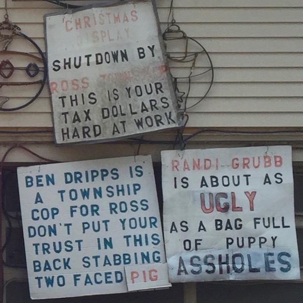 - Ross resident’s glad-turned-mad Christmas tidings targeted by township, Trib Live, Feb. 21, 2015