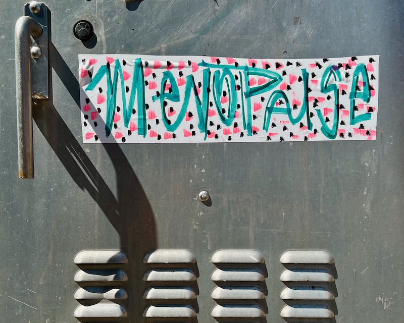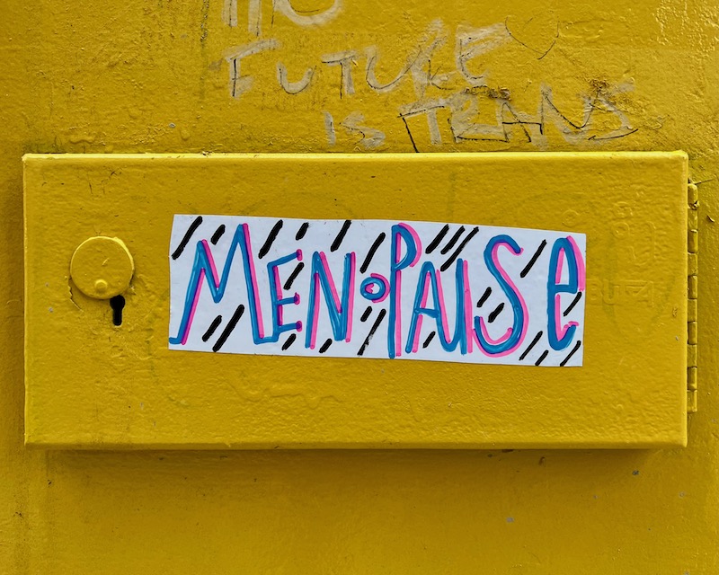 We do know the statements are attention-grabbing and hilariously out-of-context—seeing the word menopause bedazzled and glorified in the leftover spaces where taggers dwell is objectively funny.